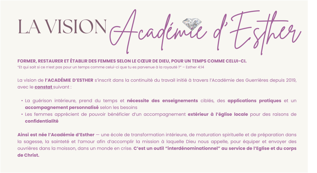 L‘ Académie d’Esther est un chemin de transformation profonde pour les femmes qui désirent se laisser former par Dieu, se laisser guérir, se positionner et entrer dans leur mission.