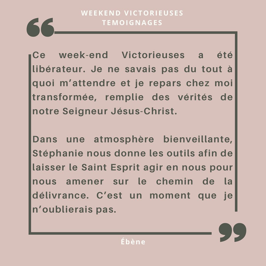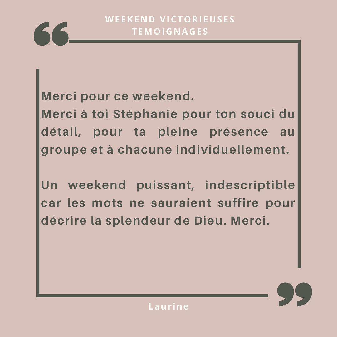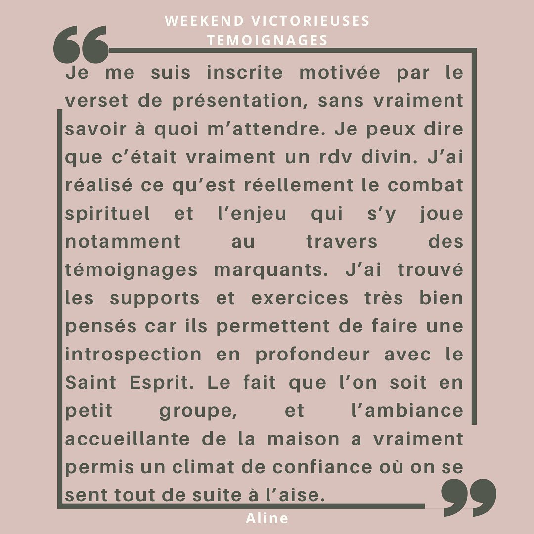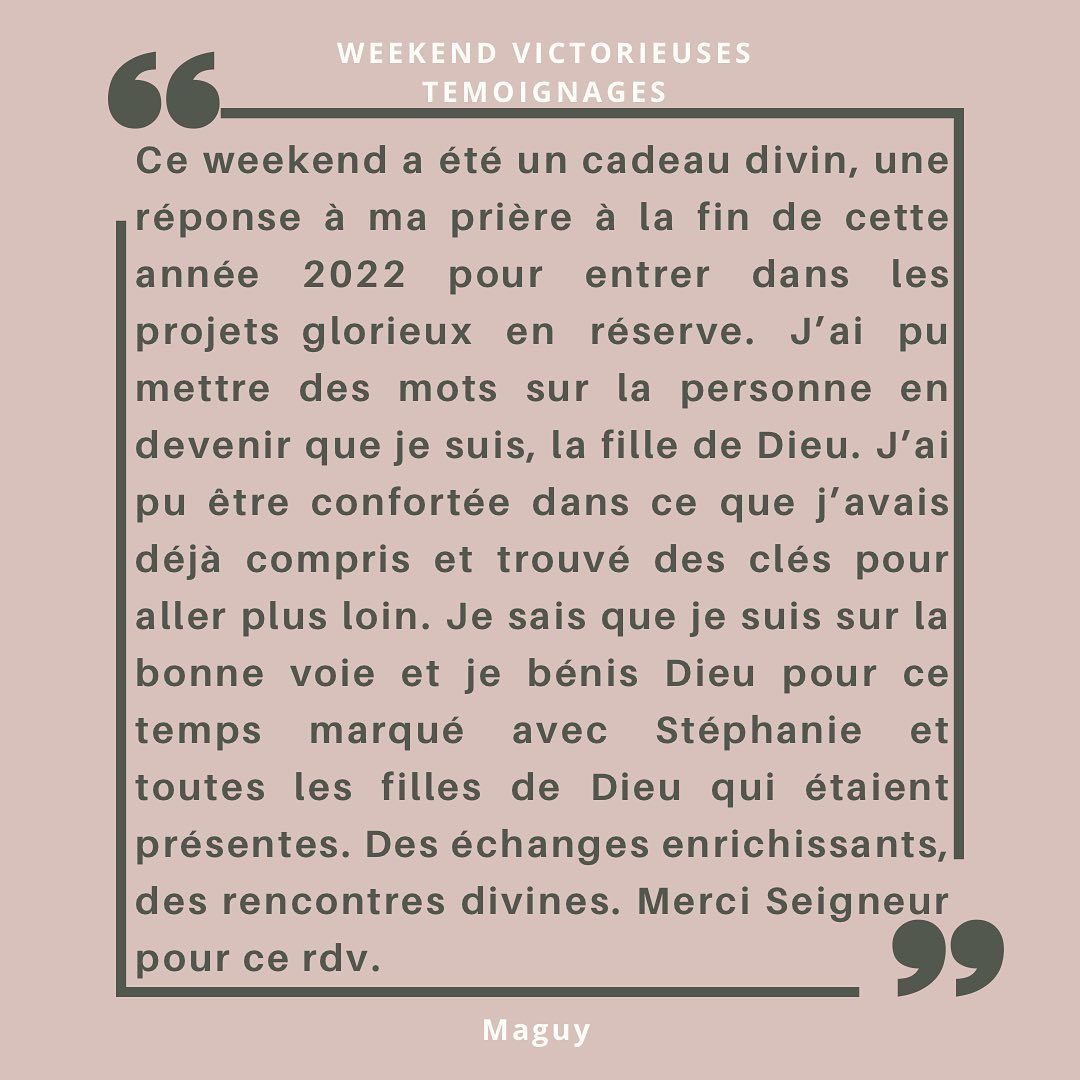 « J’ai participé à un week-end guérison et délivrance en février et je ramène avec moi une marque et un bon souvenir de ce que j’y ai vécu. J’ai pu adorer Dieu, apprendre les unes avec les autres, laisser les douleurs aux pieds de la Croix. Ces moments ont été forts, ont permis d’être à l’écoute, dans la louange, les conversations, les repas… Il y a eu des encouragements et des enseignements guérissants. C’était vraiment super ! C’est une retraite que je conseille vraiment aux femmes. Je suis rentrée chez moi vraiment transformée et rafraîchie par le Saint-Esprit. Si vous y allez, ouvrez votre coeur à Jésus-Christ et vous serez étonnée de sentir le parfum de Sa présence. Soyez bénies. »